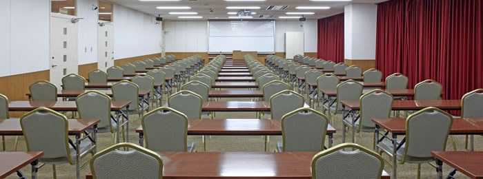 演台(1) 固定白板(1) 受付机(1本)椅子(1脚) 講師用机(1本)椅子(1脚) 会議机(45本) 会議椅子(126脚) |